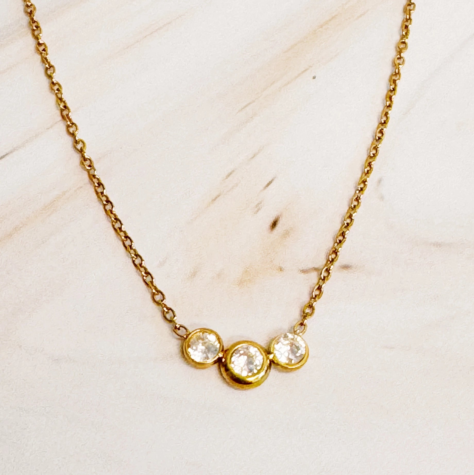 Elevate your everyday style with the Minimalist Three Stones Necklace. This delicate piece features three subtle stones arranged elegantly, offering a refined touch to any outfit. Its simple design makes it perfect for layering or wearing alone, bringing effortless sophistication to your look. Whether for daily wear or special occasions, this necklace adds a graceful sparkle that complements your natural elegance.