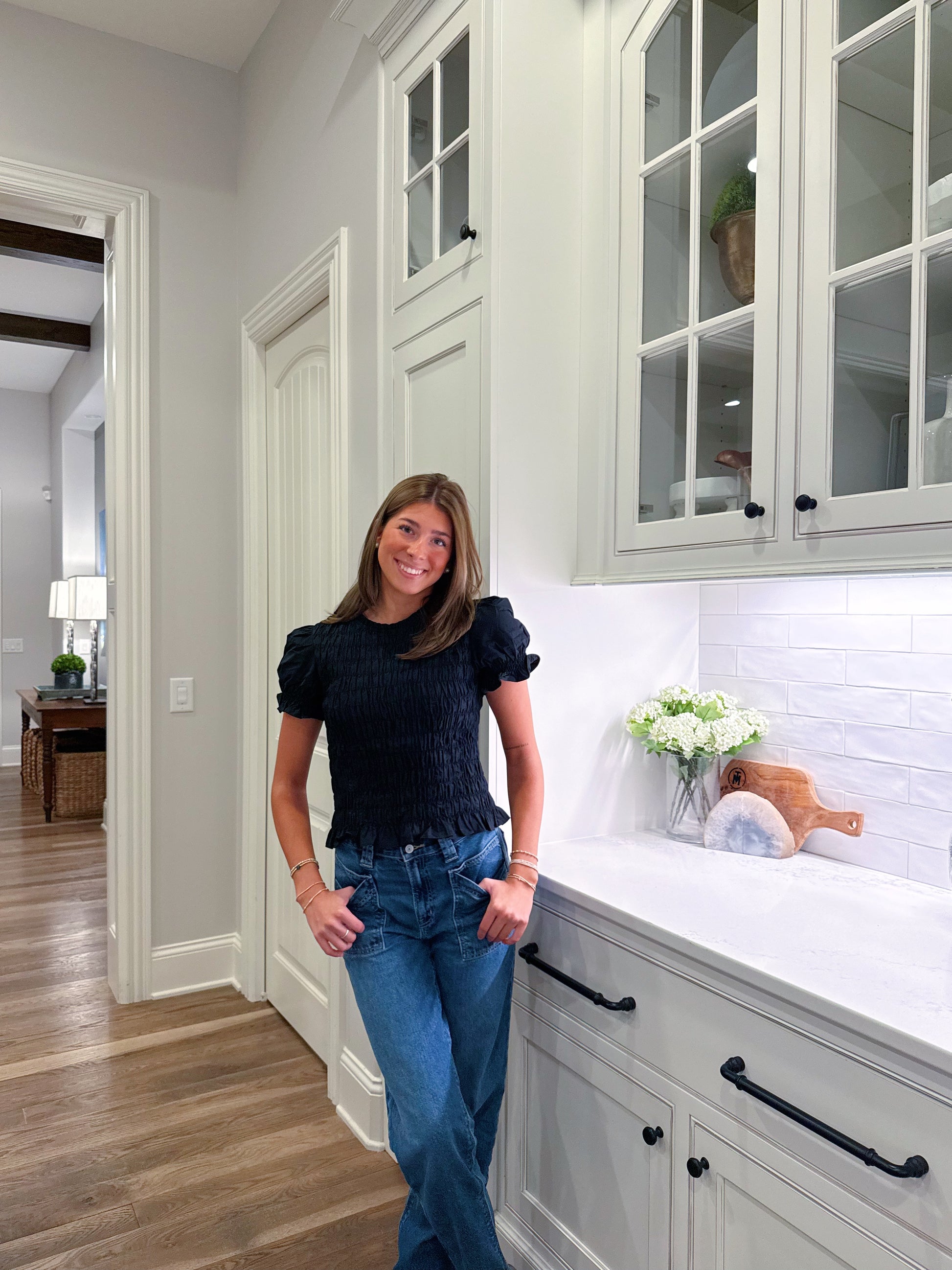 The Sloane Top brings effortless elegance to your everyday wardrobe. Crafted in a flattering black hue, this piece features delicate ruching that skims your silhouette beautifully while small puff sleeves add a touch of romantic charm. Versatile enough for casual outings or dressed up for evening plans, this top pairs seamlessly with jeans, skirts, or trousers. The thoughtful design details make it a wardrobe essential that works harder than it looks.